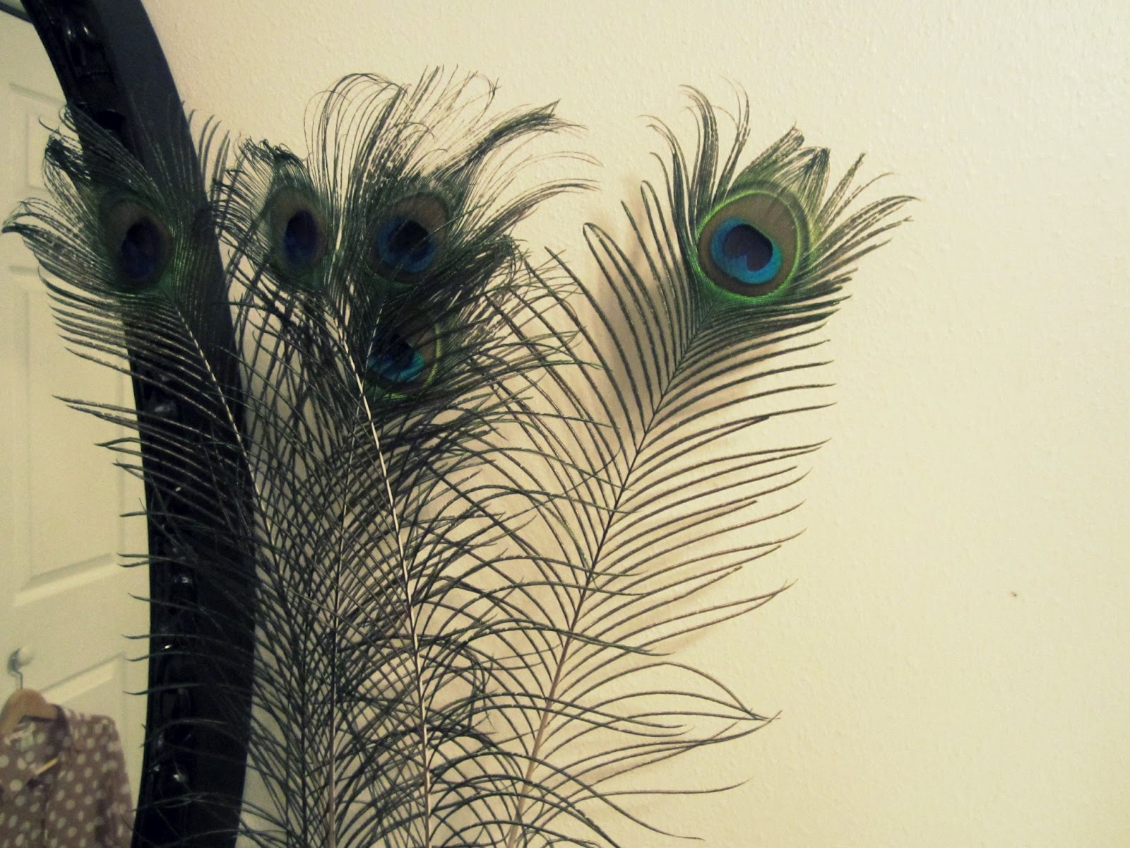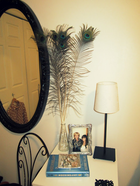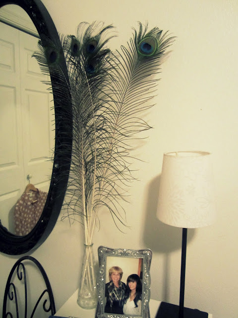My nightstand looks wonderful with these feathers next to my newly painted vintage mirror.